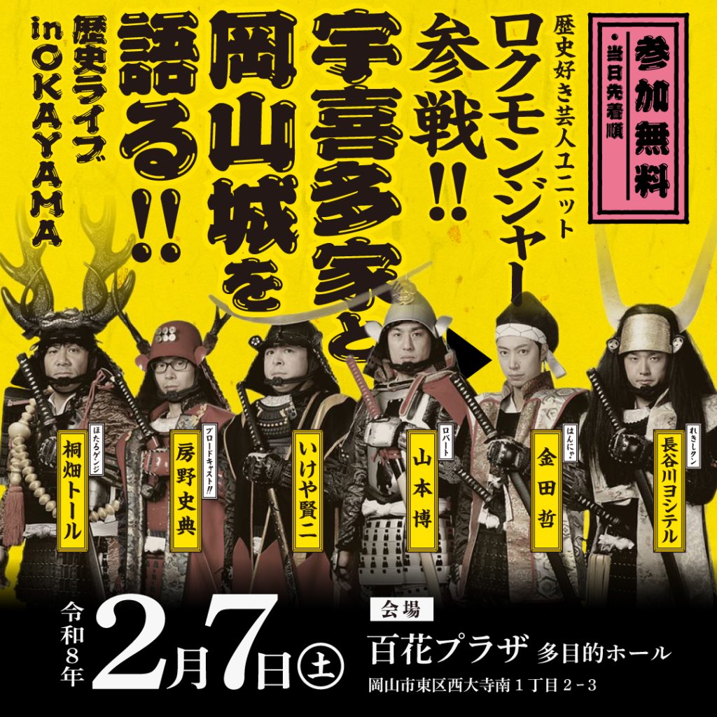 歴史好き芸人ユニット「ロクモンジャー」が、宇喜多家や岡山城の歴史を時におかしく、時に真面目に歴史を面白く語る歴史ライブを開催します。イベントの詳細は公式HPをご確認ください。皆さんのご来場をお待ちしています!